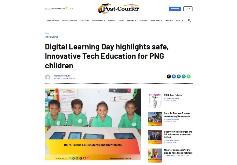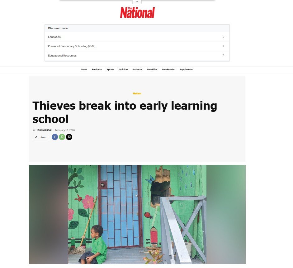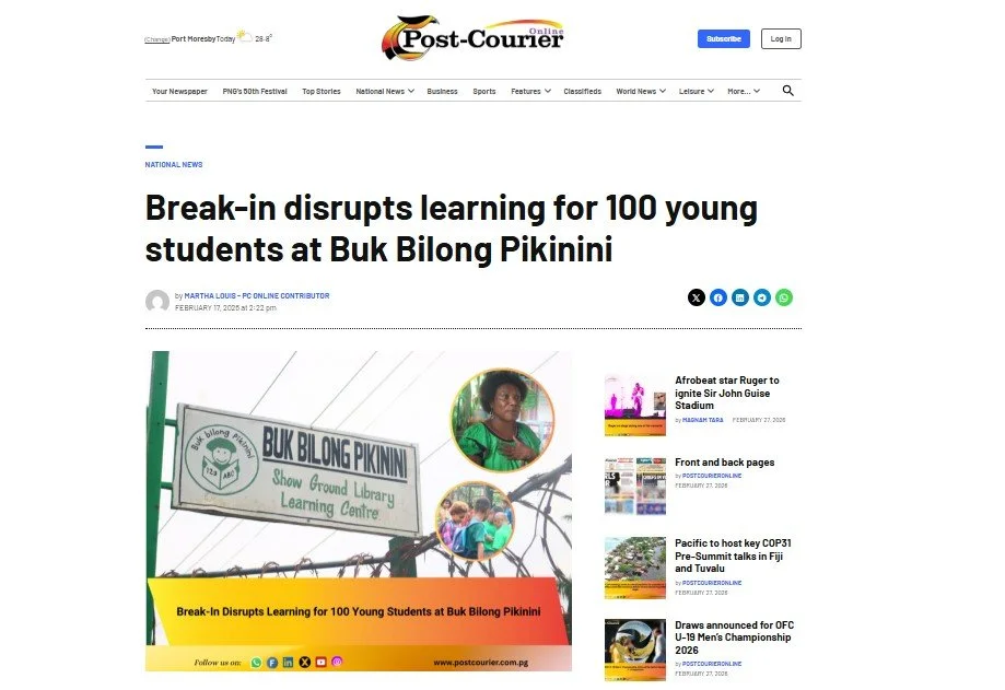 2026 News Articles Date: February 25th Digital Learning Day highlights safe, Innovative Tech Education for PNG children - Post Courier Thieves break into early learning school - The National Date: February 18th Break-in disrupts learning for 100 young students at Buk bilong Pikinini - Post Courier Date: February 17th 2025 Newspaper Articles