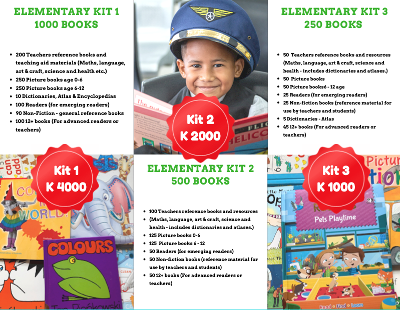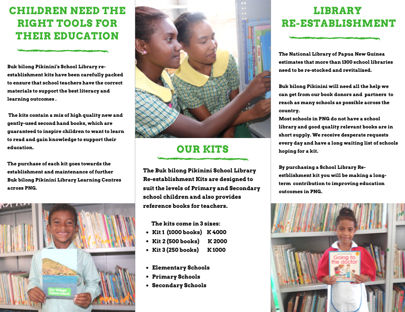 Buk bilong Pikinini seeks to support schools across the country to re-establish their school library or re-stock their shelves with high quality and appropriate new or second hand books. We have developed three types of School Library Re-establishment Kits, which are available for purchase for our partners in both PNG and Australia and in turn donated to schools around the country. We have a very long waiting list - and receive requests every day - but are doing our best to get to everyone. We would love your support to reach more schools across PNG. Please see our brochure below for content and pricing. The costs cover manpower for storage, packing and logistics associated with delivery.