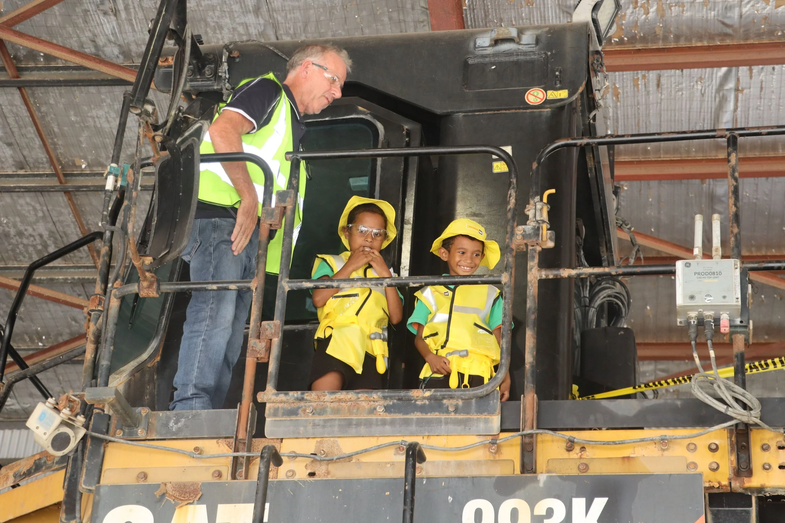 Buk bilong Pikinini students explore the big machines at Hastings Deering