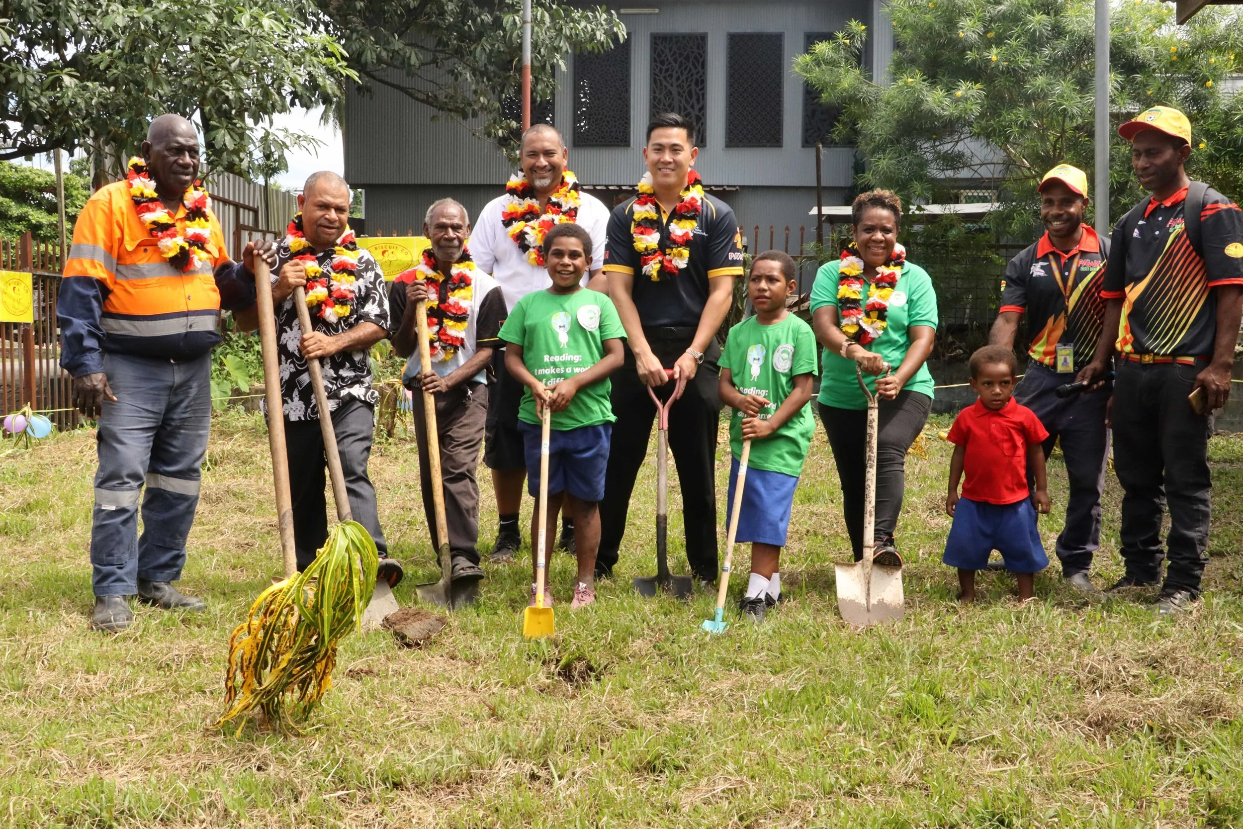 Pictured here is Mr Bafuanu and Buk bilong Pikinini Executive Officer Leanne Resson at a recent ground breaking ceremony of the opening of a new library in Lae, with Lae Biscuit and The Chow Foundation.