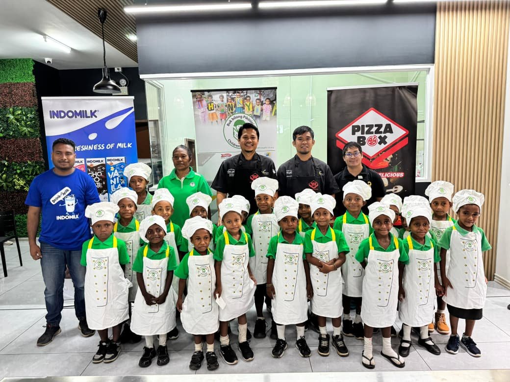 The children were warmly welcomed by Chef Rian, the Pizza Box team, and special guest Fredi Noviandi, Assistant Marketing Manager from Kone Development Ltd (SVS) and got given a behind-the-scenes tour of the busy kitchen. They learned about food safety, hygiene, and the importance of teamwork in the hospitality industry before rolling up their sleeves to make their own pizzas from scratch. From mixing ingredients to loading colourful vegetable and cheese toppings, smiles (and sauce) were everywhere!